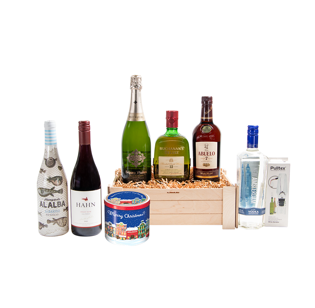 RON ABUELO 7 AÑOS, BUCHANAN´S 12 AÑOS, VODKA NEW AMSTERDAM, SEGURA VIUDAS BRUT VINTAGE, HAHN PINOT NOIR, NAVEGANDO AL ALBA ALBARIÑO, PANETONE CLASSICO, PULLTEX AERATOR
